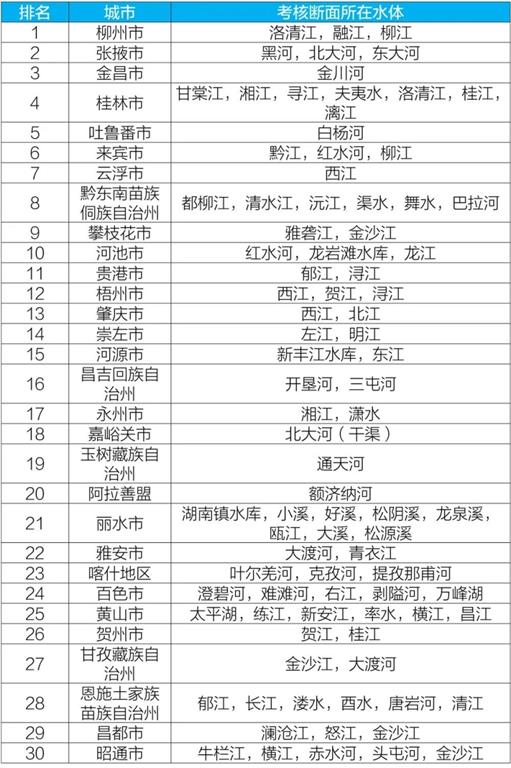 2020年10月國家地表水考核斷面水環(huán)境質(zhì)量狀況排名前30位城市及所在水體