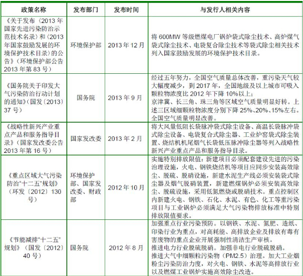 根據(jù)《國務(wù)院關(guān)于印發(fā)大氣污染防治行動計劃的通知》(國發(fā)〔2013〕37號)的要求,到2017 年,全國地級及以上城市可吸入顆粒物濃度比2012 年下降10%以上;京津冀、長三角、珠三角等區(qū)域細顆粒物濃度分別下降25%、20%、15%左右;加快重點行業(yè)脫硫、脫硝、除塵改造工程建設(shè)。所有燃煤電廠、鋼鐵企業(yè)的燒結(jié)機和球團生產(chǎn)設(shè)備、石油煉制企業(yè)的催化裂化裝置、有色金屬冶煉企業(yè)都要安裝脫硫設(shè)施,每小時20 蒸噸及以上的燃煤鍋爐要實施脫硫。除循環(huán)流化床鍋爐以外的燃煤機組均應(yīng)安裝脫硝設(shè)施,新型干法水泥窯要實施低氮燃燒技術(shù)改造并安裝脫硝設(shè)施。燃煤鍋爐和工業(yè)窯爐現(xiàn)有除塵設(shè)施要實施升級改造;京津冀、長三角、珠三角等區(qū)域要于2015 年底前基本完成燃煤電廠、燃煤鍋爐和工業(yè)窯爐的污染治理設(shè)施建設(shè)與改造,完成石化企業(yè)有機廢氣綜合治理。